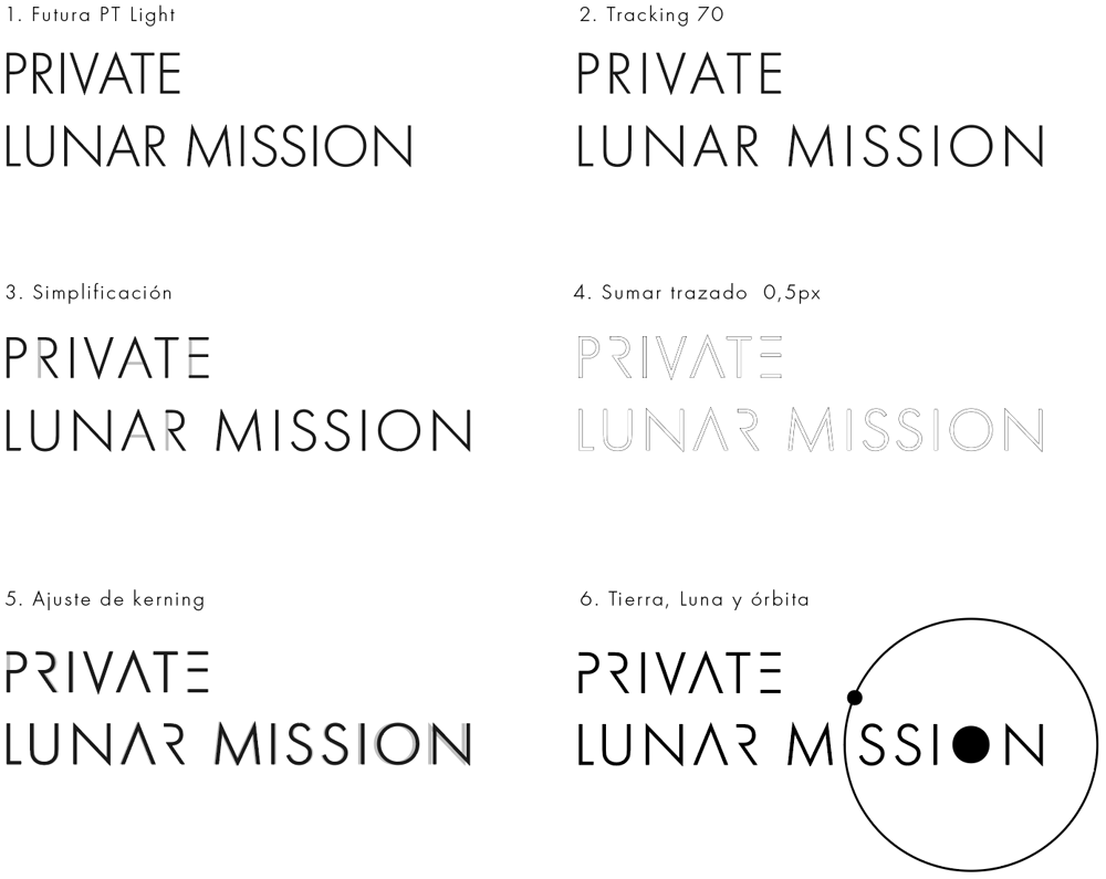 Este logotipo tipográfico ha sido creado a partir de la fuente Futura PT, eliminando todos los elementos posibles pero manteniendo una lectura clara, de la misma manera que se hace en los planos con las acotaciones. Algunas letras tienen su lado oculto, de la misma forma que la Luna.